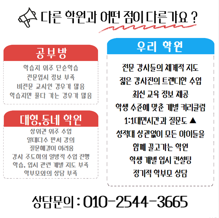| 구파발 수학 전문학원 은평뉴타운 이과학원 소수정예 내신 관리 (초등 중등 고등) (0) | 2021.09.07 |
